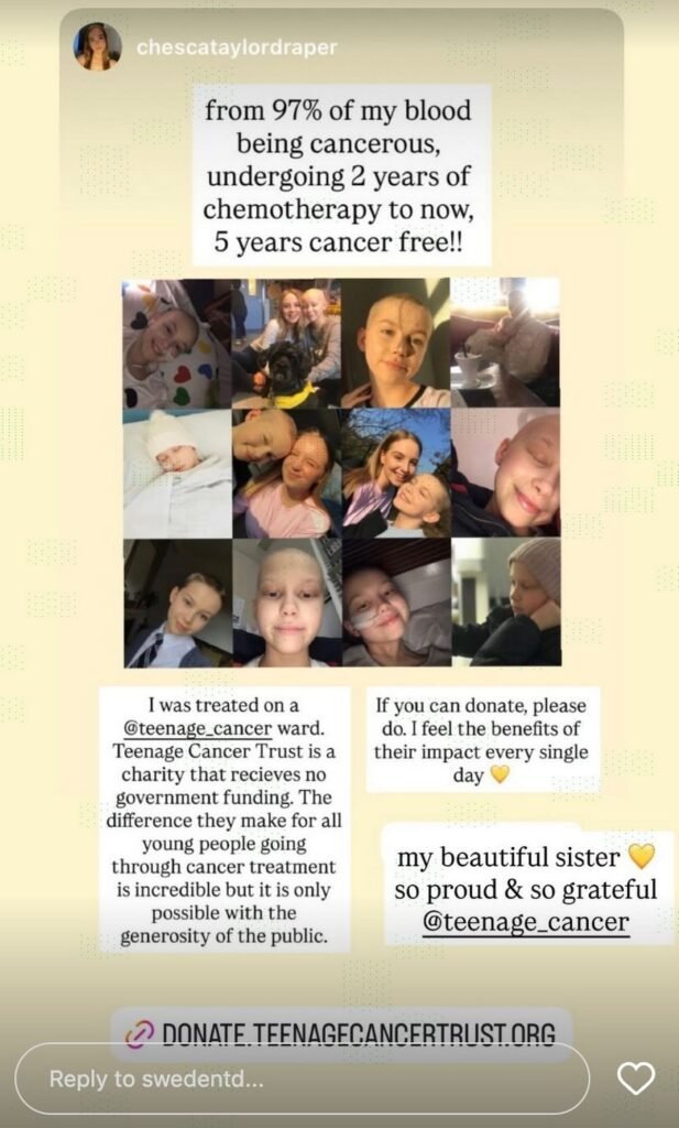 Eden proudly re-posted her sister’s message on her own Instagram Story, saying: “My gorgeous sister. So proud and so thankful @teenage_cancer.”