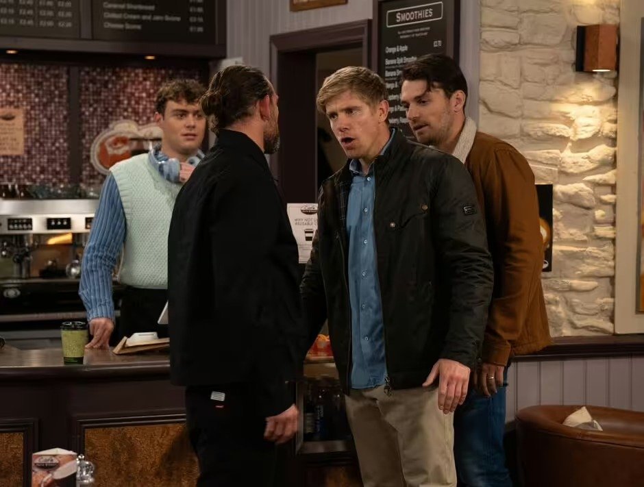 Meanwhile, Kev Townsend (Christopher Coghill) ends up in a confrontation with Mack Boyd (Lawrence Robb) over a spilled coffee, all while continuing to maintain his lie about his “impending death” to keep Robert Sugden (Ryan Hawley) close.